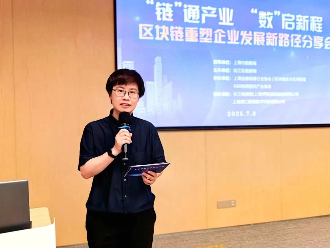 7 月8 日下午,“链”通产业,“数”启新程 —— 区块链重塑企业发展新路径分享会在上海市松江区成功举办。本次活动由上海市数据局指导,松江区数据局主办,上海金融信息行业协会|区块链技术应用联盟、G60商用密码产业基地联合承办,长三角数链(上海)网络基础设施有限公司、上海浦江数链数字科技有限公司共同协办。活动吸引了60多位区政府部门及企业代表参与,聚焦区块链技术带来的数字化转型新路径。活动由上海金融信息行业协会、区块链技术应用联盟副秘书长臧琴主持。