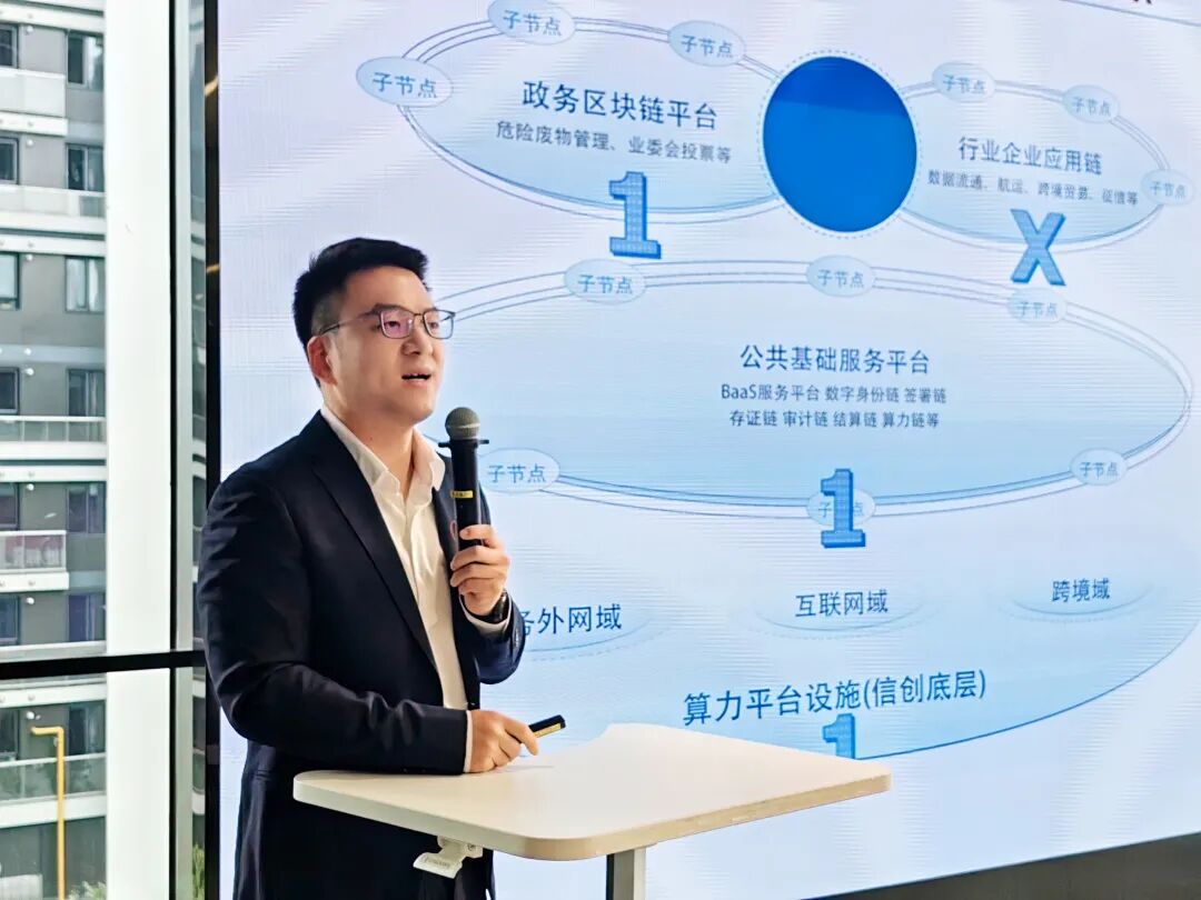 主题分享环节,企业代表聚焦实战经验展开交流。作为国家级区块链网络上海枢纽的建设和运营主体长三角数链 COO 刘磊以《区块链赋能数字新基建,强化公共服务能力》为题,介绍了“1+1+1+X”的整体架构以及在此基础上推出的“北宸可信”系列产品能力服务,并重点介绍了北宸可信数据服务中心“存查验享”四大功能;
