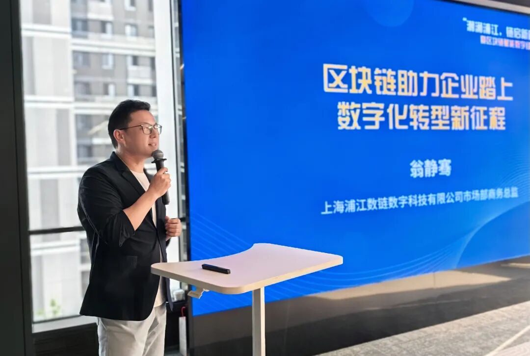 浦江数链市场部商务总监翁静骞在《区块链助力企业数字化转型新征程》中,结合“智贸链通”、“沪驾宝”、“从法链”等案例分享了企业上链用链的经验和成果;